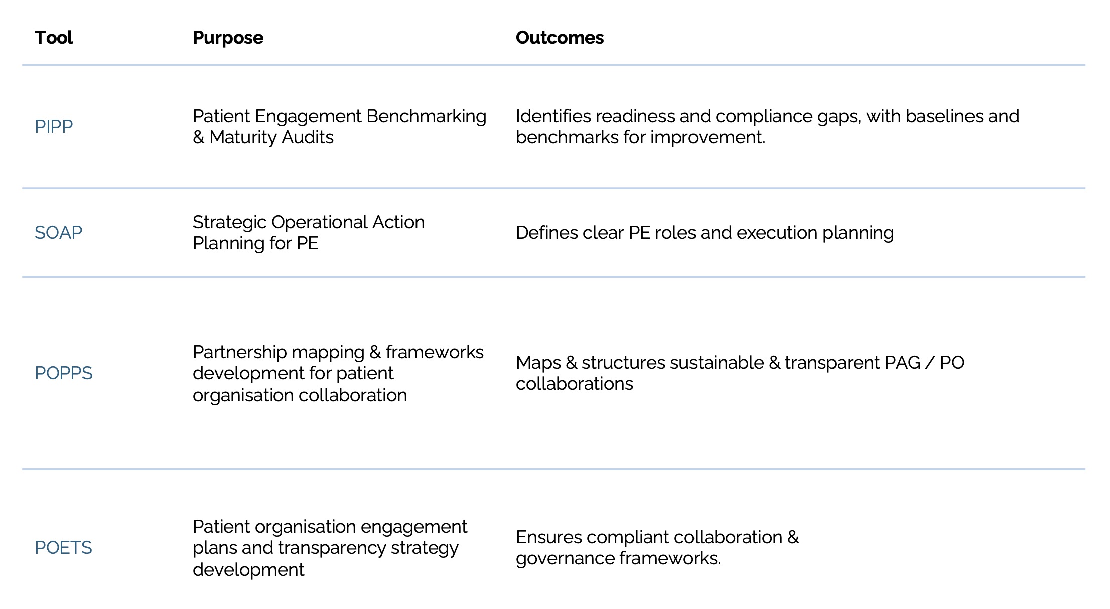 Deliver audits, benchmarking, playbooks, frameworks and communication strategies to standardise patient engagement across global teams.